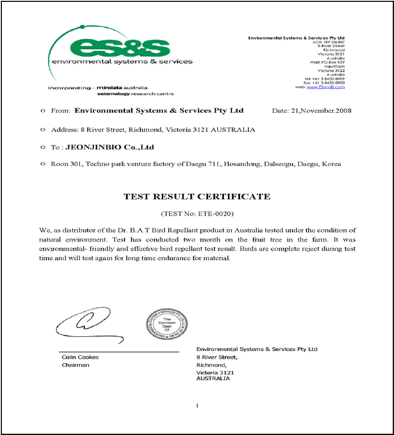 ES&S社は豪州において環境エンジニアリング事業を営む会社として、現地でドクターバットを販売するために豪州現地の農場で2ヶ月間ドクターバットをフィールドテストを行い、その結果、確実に鳥類退治がされたことを確認した公文を送っている。