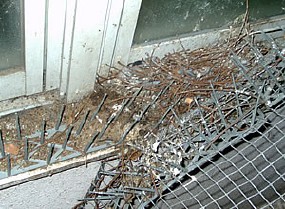 窓枠の部分にハト避けグッズを取り付けてあったのですが、うまくその隙間を利用して、ハトが営巣してしまいました。棘の部分をうまく利用して、営巣材料を固定してしまっています。