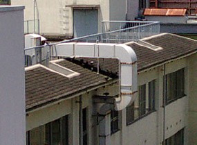 写真中央のダクトと屋根の間で陰になっている場所がハトの休憩場所でした。